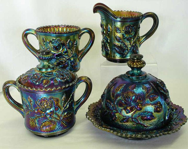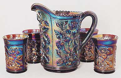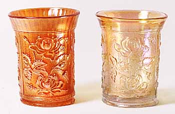 | Essentially the same as Imperial's other Rose pattern, Open Rose. Both are shown in early Imperial catalogs as the same pattern, but collectors have come to refer to the water sets, table sets, and footed bowls as Lustre Rose. Imperial made two versions of its Lustre Rose tumblers. The regular tumbler, in marigold, is on the left. It has vertical flutes inside. The variant, on the right in clambroth, does not have the flutes. Variant pitchers also lack the fluting. Water sets are known in amber, clambroth, green or Helios, marigold and purple.