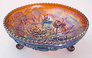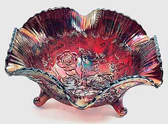 | The large footed fruit bowl above is red, an extremely rare color for Imperial. These large bowls are found in amber, aqua, blue, clambroth, green, lime green, marigold, olive, purple, red, smoke and vaseline.