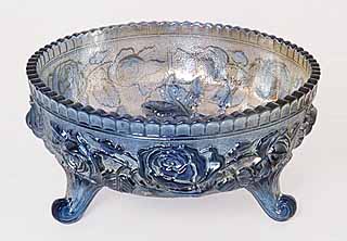 These low squatty bowls (center photo) with the sides straight up are called ferneries. Interestingly, blue, rare in Imperial, is the most common here. Other colors include amber, amberina, aqua, powder blue, clambroth, green, marigold, olive, purple and smoke. Centerpiece bowls are the same piece but have been stretched into an ice cream shape as shown in the photo to the right. |