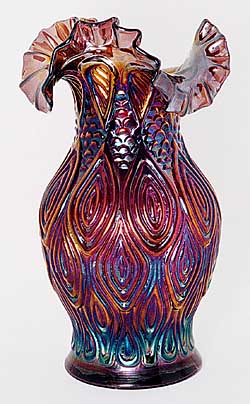 | These rare vases, 10 inches tall with a 4 1/8 inch base, are found in the typical Millersburg colors of amethyst, green, and marigold. They invariably have this three-ruffled top with crimping.