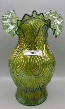 In a survey on the Internet Carnival Glass club (www.cga) early in 2009, 26 of these vases were identified as being in various collections; with a number more suspected but not known. There were about 10 each in amethyst and green and perhaps 6 in marigold. |