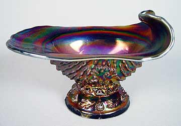 The Nautilus pattern predated the Carnival era and has been called Argonaut Shell. Northwood produced an extensive line in custard and opalescent glass--some molds have the early "Northwood" in script. The molds were transferred to Dugan who produced the few limited shapes in carnival. Apparently Dugan did not immediately remove the mark, which is why some pieces are found with a faint Northwood script mark on the inside bottom. The photo on the right shows the mark; you can just make out the "hw" in Northwood. The pieces above are both made from the same mold--the gravy or creamer on the left has one edge pulled up, the sugar on the right two opposite edges pulled up. |