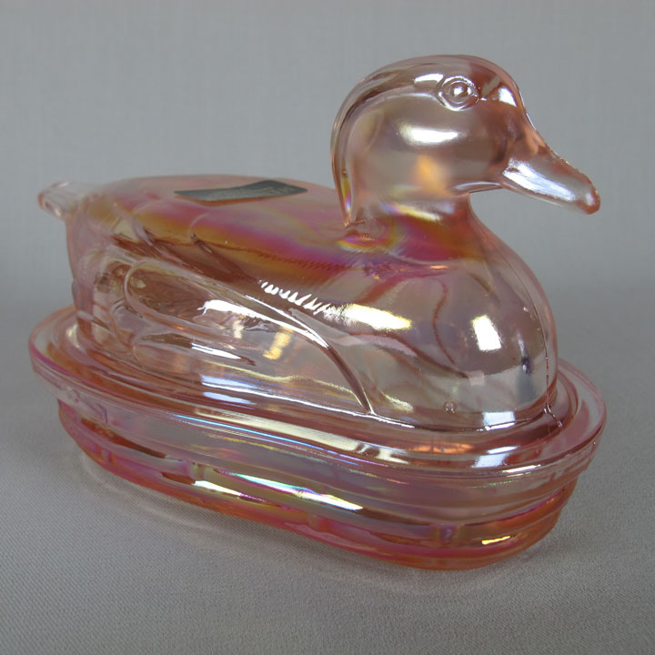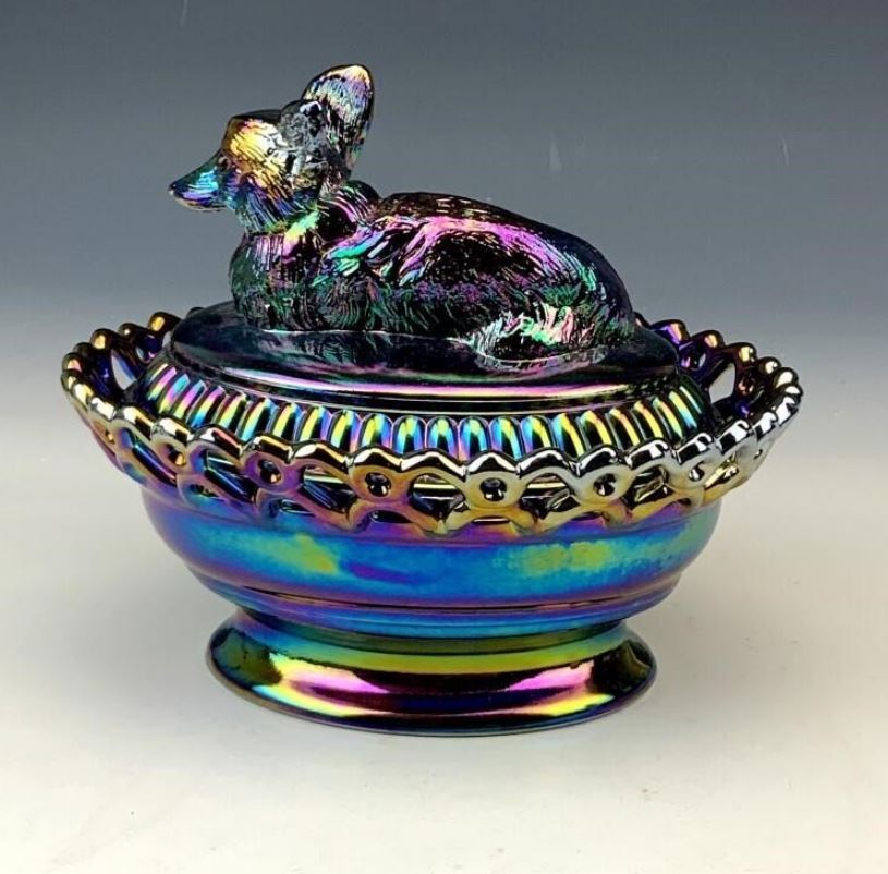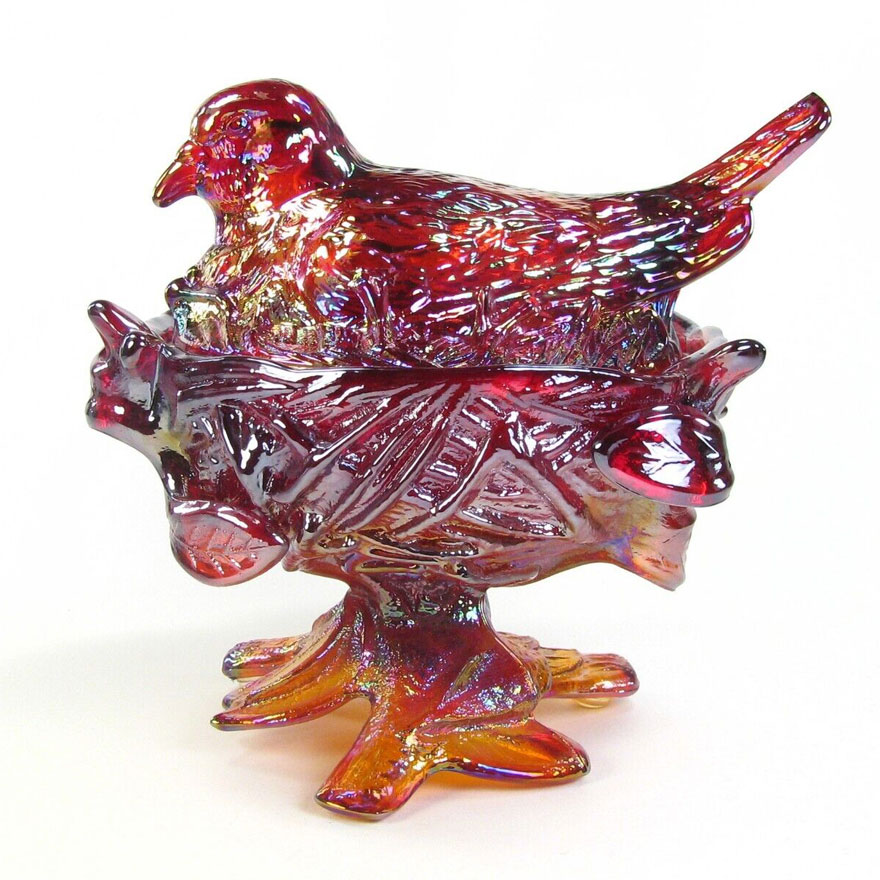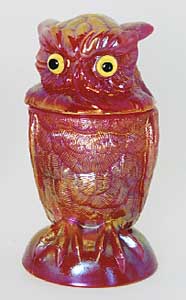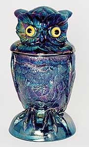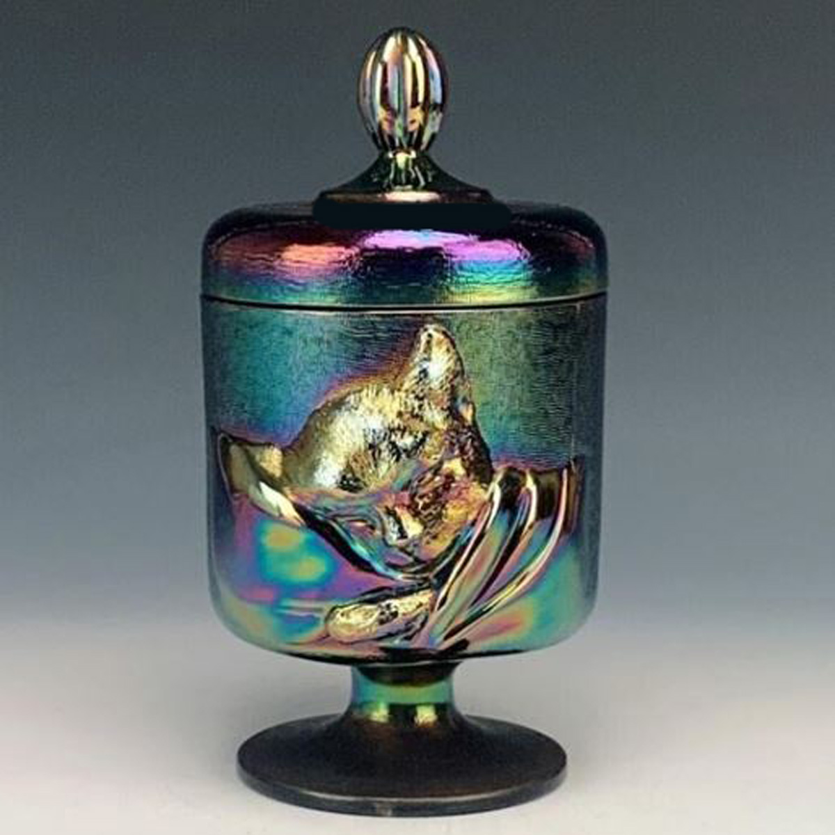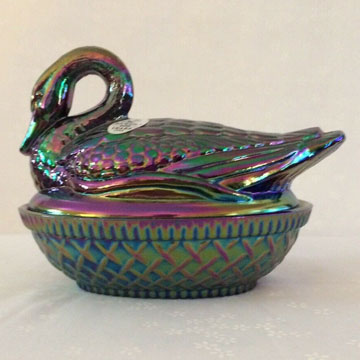 ![]() Bird on Nest, Imported - Originally a Westmoreland mold, these Bird on Nest covered jars appeared in an ad for AA Imports in purple. Hansen iridized some. |