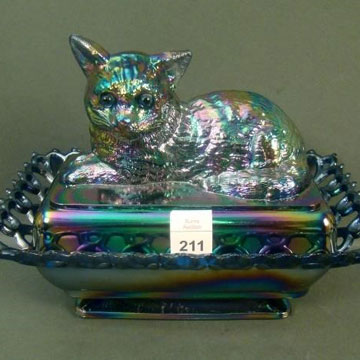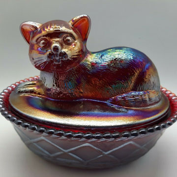 ![]() Chessie the Cat, Fenton - This cat covered jar was made, in amethyst. for the Chesapeake and Ohio Railroad as a gift for their customers. Fenton subsequently made it in many colors. |