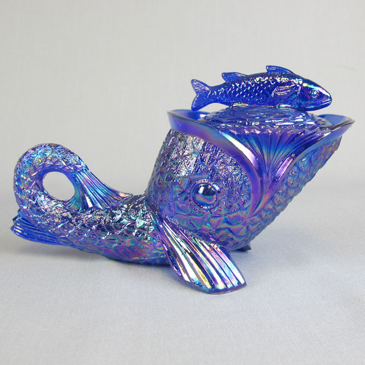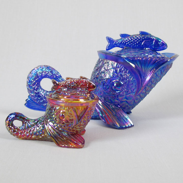 ![]() Dolphin, St Clair and Summit - These covered candy dishes are made to resemble older Greentown pieces. First made by St. Clair and so marked, they were subsequently made by Summit as unmarked examples. Found in blue, green and purple. |