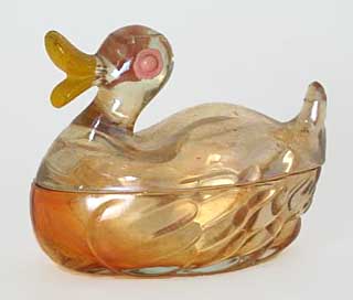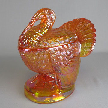 ![]() Turkey, Mosser - This large and heavy covered turkey was made by Mosser Glass. It is marked with a capital "M" in the state of Ohio. It is 9 inches tall and in a marigold color. |