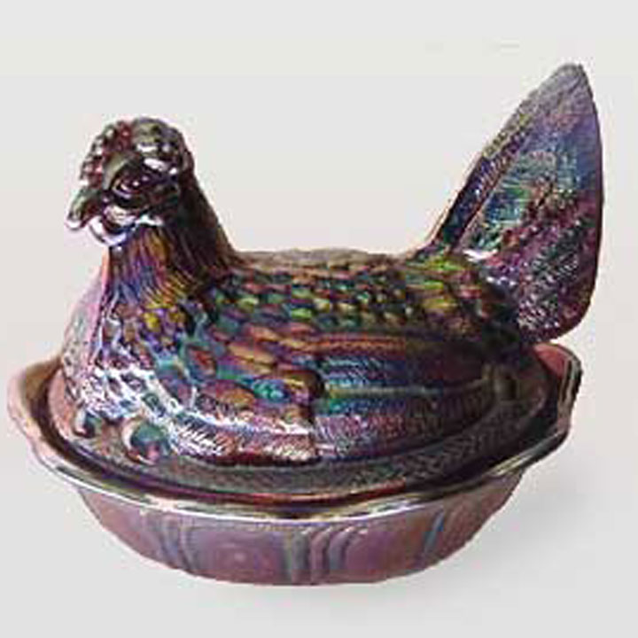 ![]() Hen on Nest, Fenton - Fenton makes two versions of the hen on nest covered dishes. The larger one, about 8 inches long, is most easily identified by the basketweave design around the base. The smaller one, about 5 1/2; inches long, has a looped design around the base. |