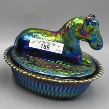 ![]() Camel, Summit - This blue covered camel was made by Summit but similar items were made by other companies. The mold was originally was marked Westmoreland but later versions are unmarked. Made in various non-iridized colors as well as turquoise and emerald green Carnival for Levay. |