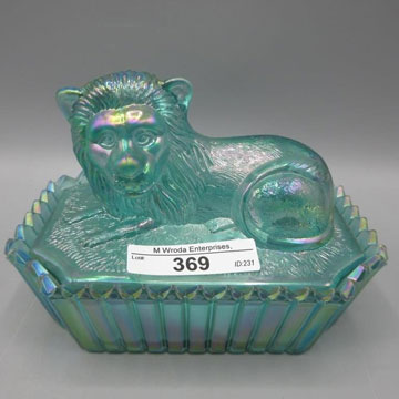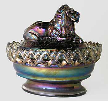 ![]() Lion, Imperial - Found only in marigold (Rubigold) and smoke (Peacock), these boxes are some of the most difficult Imperial contemporary Carnival to find. Imperial also made these in electric blue for Levay in 1978. |