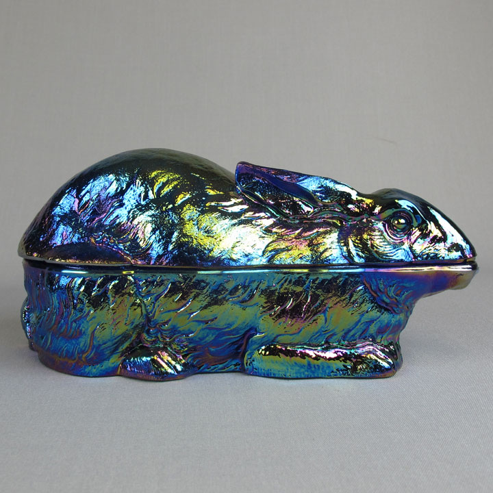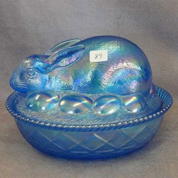 ![]() Rabbit, Westmoreland - Here is another covered rabbit dish by Westmoreland. This one is in ultra blue. Notice that the rabbit sits in a field of easter eggs. |