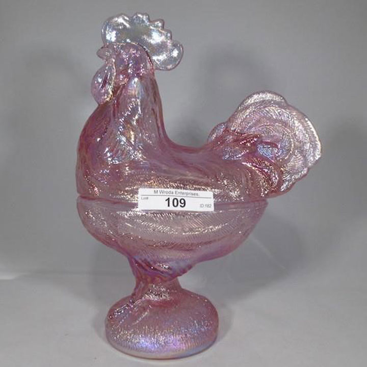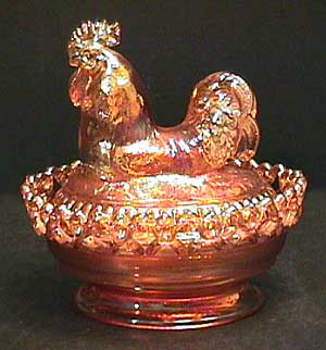 ![]() Rooster on Nest - These covered Rooster bowls were made by Westmoreland and are found in a variety of colors. The example shown here is pink. |