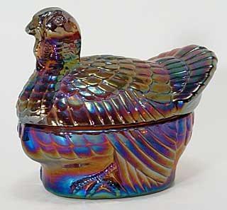 ![]() Turkey, Smith - According to Dorothy Taylor, Smith made these covered turkeys in amethyst, green, amber, amberina, and white. They are about 7 1/2" tall. Interestingly, they were shown on the Rosso site in June 2004, listed as royal plum. |