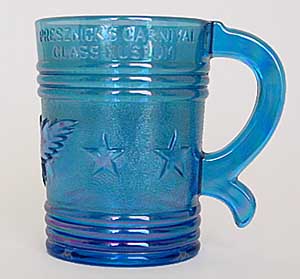 ![]() Presznick Museum, Imperial - Imperial made these 4-inch tall mugs for Rose Presznick for her Carnival Glass museum. In 1969, they were made in marigold and smoke. There is an eagle and stars on the side. Around the band at the top on one side are the words "Presnick Carnival Glass Museum," and on the other side, "Lodi, Ohio." The bottom has the Imperial IG mark, J.P.-R.P., 1969. Also made in celeste/sapphire blue in 1972. |