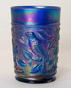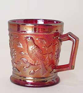 The red sets may have a pitcher made by L.E. Smith and thus marked with an "S" and tumblers marked "IG" for Imperial. This was because the Imperial workers went on strike and only made the tumblers. To fill the order, Imperial had L.E. Smith complete the work. The mugs were made in red and pink. In 1967, the red mug was used as the American Carnival Glass Association's first souvenir. |