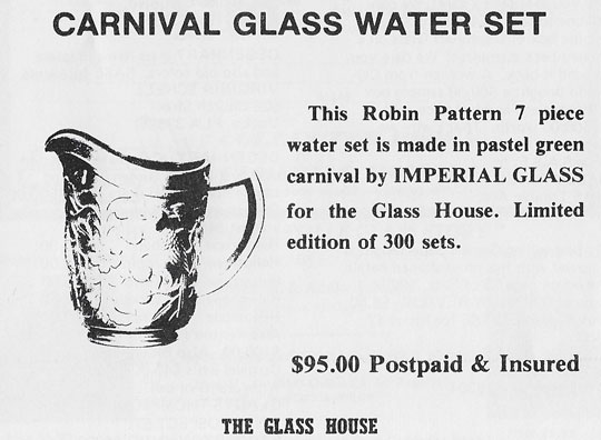 Imperial reissued its water set pieces in red (limited edition of 300), cobalt (Aurora Jewels), white, ice blue, ice green, and a color called verde green (limited edition of 300 for the Glass House - See below). White is the most often seen. Purple pieces are probably later reproductions as Imperial did not make these in purple.