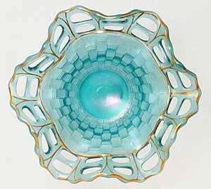 Much like Fenton's 2-row pattern but somewhat larger and with three rows of lattice at the edge. While the 2-row examples are very common, the 3-row are quite rare. Bowls are 7 1/2 to 9 inches across, depending on shape. Shown here is an ice green ruffled bowl. Bowls can be ruffled, 2-sides up, round or ice cream shaped and square. Rare 9 inch plates are even known. Colors are amethyst, celeste, ice blue, ice green, marigold, red, vaseline and white |