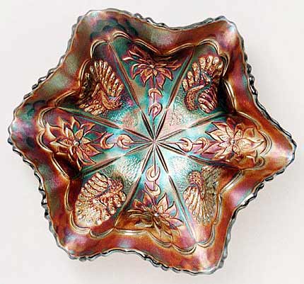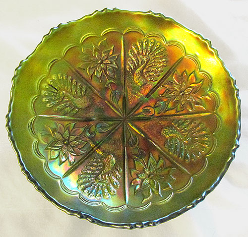 | One of Fenton's dual theme patterns. Peacock and Dahlia is similar to Fenton's Peacock and Grape but much more scare--and in a narrower range of colors. Plates and bowls only, with either a plain back or Berry and Leaf Circle. The round bowl on the right is green, a very rare color in this pattern. It is owned by Ben Cronin and the photo is courtesy of Carl and Eunice Booker. Other colors include amethsyt, aqua, blue, lime green, marigold and vaseline. Plates are only known in marigold. | |