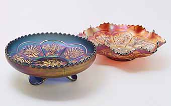 ![]() One of Fenton's most collectible patterns, Peacock and Grape is found in bowls and collar based plates in many colors. Bowls can be both spatula footed and collar based. At left is a 9 inch blue plate; above are a blue spatula footed bowl in an ice cream shape and a red ruffled bowl with a collar base. Collar based pieces have the Bearded Berry Exterior while spatula footed pieces have a plain exterior. |