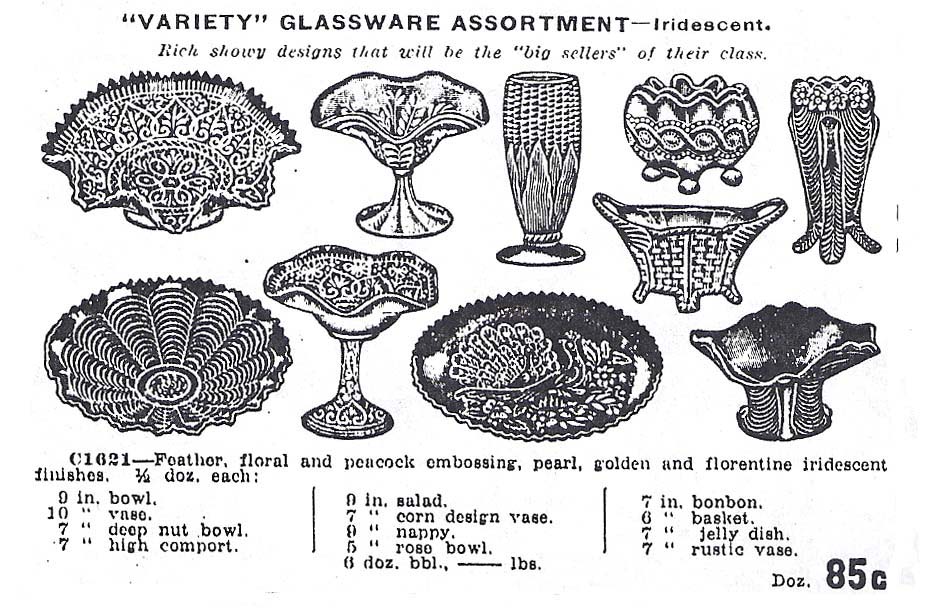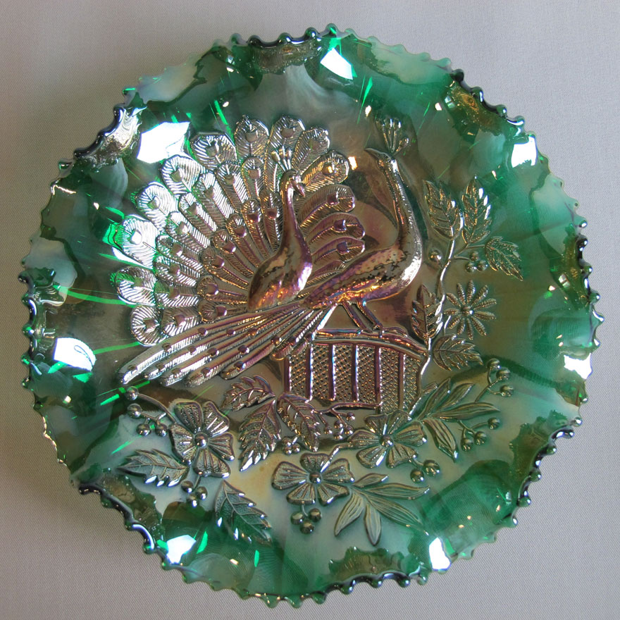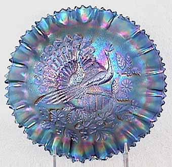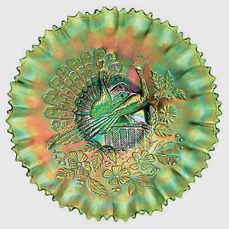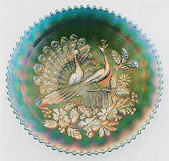 | The Peacocks pattern has two birds sitting on a fence--thus the alternate name. Most have Northwood's ribbed back although a few are known with a basketweave or a plain back. Another variation is that some pieces come with an overall stippled background (above center). The pattern only comes in plates and bowls. There are two edge treatments to the bowls, ruffled and pie crust edge (PCE). Most measure 8 to 9 inches across. Northwood's Peacocks is found in a wide range of colors. From left to right are green, renninger blue and ice blue examples. |