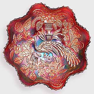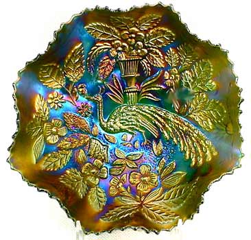 Fenton's version of Peacock and Urn is perhaps easiest to distinguish; it has a sawtooth edge and Fenton's pattern called Bearded Berry on the back. You'll also get to recognize the straight, stiff neck of the bird. As with other Peacock and Urn patterns, there is a bee just beyond the beak of the bird. The pattern comes in ruffled bowls and flat plates in several colors.