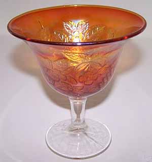 One other shape this pattern comes in is the compote. Fenton's Peacock and Urn compote is quite different and much smaller than the Millersburg piece of the same name. Most are flared and ruffled; the blue example at the left is unusual in that it is goblet shaped.