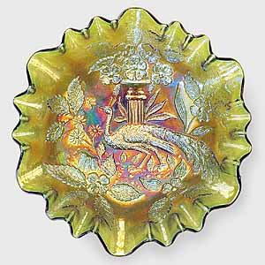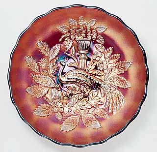 The Peacock and Urn mystery bowl is so named because its attribution was a mystery for a long time. It has beads only on the top of the bowl and top of the column. It can be distinguished quickly from other Millersburg Peacock and Urn patterns by the small leaf that overlaps the front right side of the urn. One plate has been reported in the pattern.