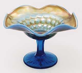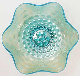 There is considerable dispute over Fenton's Coin Dot pattern and Westmoreland's Pearly Dots. For many years collectors considered those items with plain dots to be this pattern--Pearly Dots, while those with stippled dots to be Fenton's Coin Dot. It now seems that Fenton also made some of it's Coin Dot pieces with plain dots. In any event, the origin of manufacture makes little difference in the value of the piece. The amethyst plate, above left, was photographed at a 2000 Heart of America Carnival Glass club display. The ruffled bowl is in blue opal. |