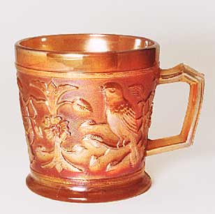 Robin is the only Imperial pattern to show a bird (or any animal, for that matter). It is seen almost exclusively in marigold with an occasional smoke tumbler that sometimes sells for more than a complete water set in marigold. Both water sets and mugs have been reproduced, so any color other than marigold would be a contemporary piece. |