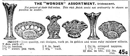 | This Butler Brothers catalog ad from 1910 shows the Rococco vase along with other Imperial pieces including miniature Morning Glory vases and Three in One, Tulip & Cane and Diamond Ring bowls. |