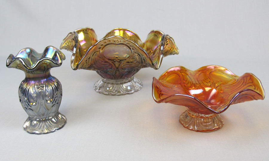 To the left are a smoke vase, a 9 inch bowl also in smoke and a 6 inch bowl in marigold. Colors found are lavender, marigold and smoke. |
