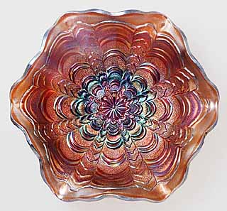 Rosalind has radiating arcs that are reminiscent of peacock tail designs. It's a scarce pattern found in several sizes of bowls, rare 9 inch plates, two sizes of compotes (6 and 9 inches tall) and, in 2002, the discovery of the first chop plate (in marigold). The pattern was also used as the interior of Millersburg's Dolphins compotes.