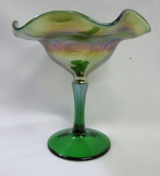 There are three sizes of bowls. The small sauces are about 6 inches across and can be found ruffled or in an ice cream shape. The medium or standard size bowls are about 8 to 9 inches across and are also found ruffled or in an ice cream shape. These medium size bowls have a collar base that is 3 inches across. The large size bowls are 9 to 10 inches across and have a collar base that is 3 7/8 inches across. The large size bowl is found much more often than either the sauce or the medium size bowl. The sauces are found in amethyst, blue, green and marigold. The medium size bowls only seem to be found in green. And the large size bowls are found in amethyst, green and marigold and to a lesser extent in aqua or olive green. Nine inch plates are quite rare and have been found in amethyst and green. A single 11 inch chop plate is known in marigold. Beware of the contemporary Fenton low compote, Drape and Tie, which has an almost identical pattern, being offered as Rosalind. Also see Rosalind variant compotes |