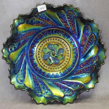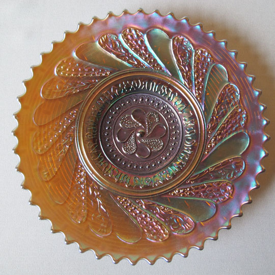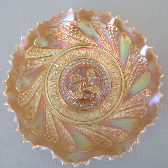 Ruffled bowls can sometimes be so low that collectors may consider them "low ruffled plates" and are more desirable than the deeper ruffled examples. The amethyst bowl shown here, on the left, is such a piece. In the center is a true plate in amber. Above right is a bowl in peach opal. To the right is a photo of Roundup's back pattern. It is called Reedy Basketweave and is also the back pattern of Apple Blossom Twigs and Fanciful. |