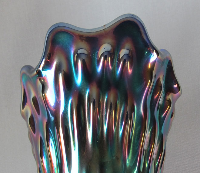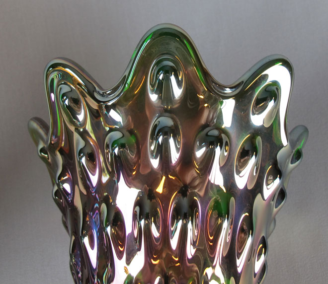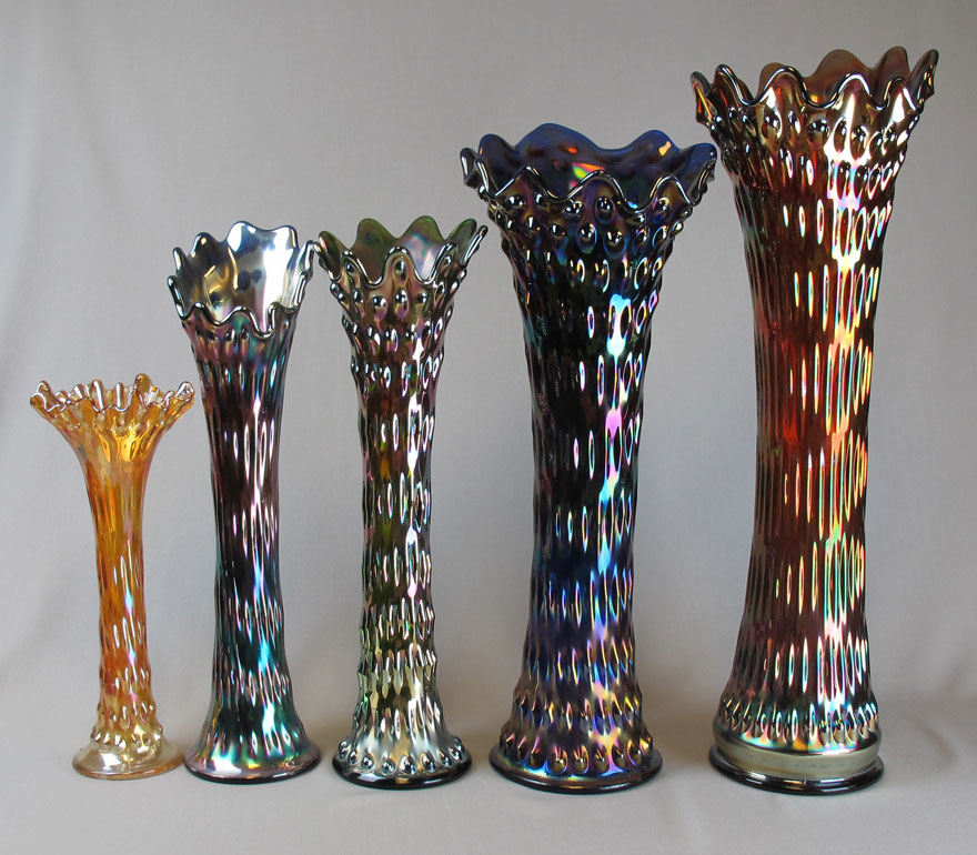 At left is a typical marigold standard vase. These have a 3 to 3 1/4-inch base and are 6 to 11 inches tall. Some have tight crimped tops such as this one. Standard vases have nine rows of hobs around the body of the vase and eight flames at the top. The second and third to the left shows the midsize and midsize variant, both with 4 to 4 1/4-inch bases. The variant is most easily distinguished by the hobs in each of the nine flames. The two photos to the right show the tops of the two mid-size vases. The top photo is the regular mid-size and the bottom is the variant and clearly shows the extra hob in the flames. Mid-size vases have seven rows of hobs around the body of the vase and 10 flames at the top. Mid-size Variant vases have ten rows of hobs around the body of the vase plus one extra row of hobs in the nine flames at the top. The two vases to the right show the two versions of the Rustic funeral size. These have a 5 to 5 1/4-inch base and heights between 17 and 23 inches. The example on the far right has a secondary collar base called a band or plunger. Funeral vases have 11 rows of hobs around the body of the vase and 10 flames at the top. Plunger based funeral vases have nine rows of hobs around the body of the vase and 12 flames at the top. All sizes come in various colors. |