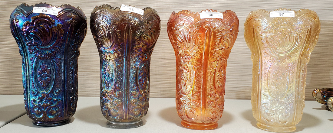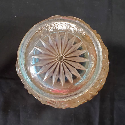 | Quite a rare vase with only a few selling.  However, at the American Carnival Glass Association convention in 2022, these four vases were sold by Wroda Auction Services.  They are purple, smoke, marigold and clambroth. The original vases have a star impressed on the base like the one shown to the right on the clambroth example above. They were reissued by Imperial. If the vase is flared or marked with an IG on the inside bottom, it's one of the newer ones. |  |