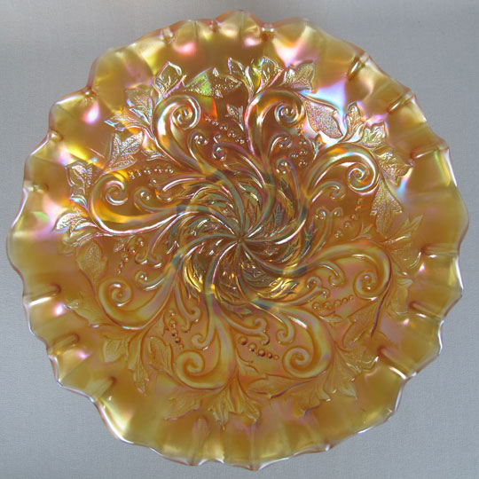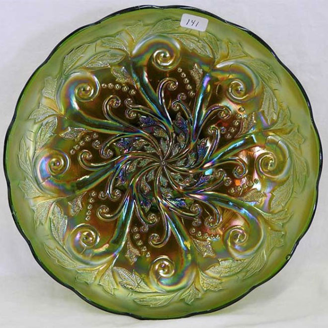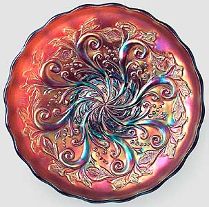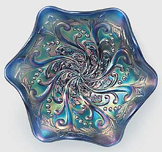 | A rather elaborate pattern dominated by question mark shapes swirling around the center. Found in several sizes of bowls and a very rare plate. The bowls are found in a large size, about 10 inches across; a standard size, about 9 inches across and a sauce, about 6 inches across. The actual measurement of any bowl depends upon the shaping of the edge. The ice cream shape (shown above in amethyst) is very rare. Next is a blue ruffled sauce. Sauces in any color are hard to find, but the blue, a scarce Millersburg color, is particularly rare. Below is a large bowl in marigold with a 3-in-1 edge and a standard bowl in green with an ICS edge. |