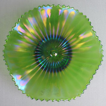 The aqua opal and green bowls above are examples of Northwood' Smooth Rays pattern. These seven inch bowls have a sawtooth edge. Five inch sauces have a smooth edge. Rare ten inch bowls have been found and an even rarer spatula footed bowl with Meander exterior is known.