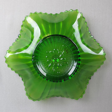 Found in these bowls and also in a 2 handled bonbon and a six ruffle compote, many are easily identified as Northwood by the basketweave exterior as can be seen on the aqua opal bowl above. Many will also have the Northwood "N" mark on the button in the center. The green bowl above has a plain back and a poppy in the marie as shown to the left. Also found in amethyst, blue and marigold. |