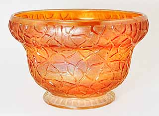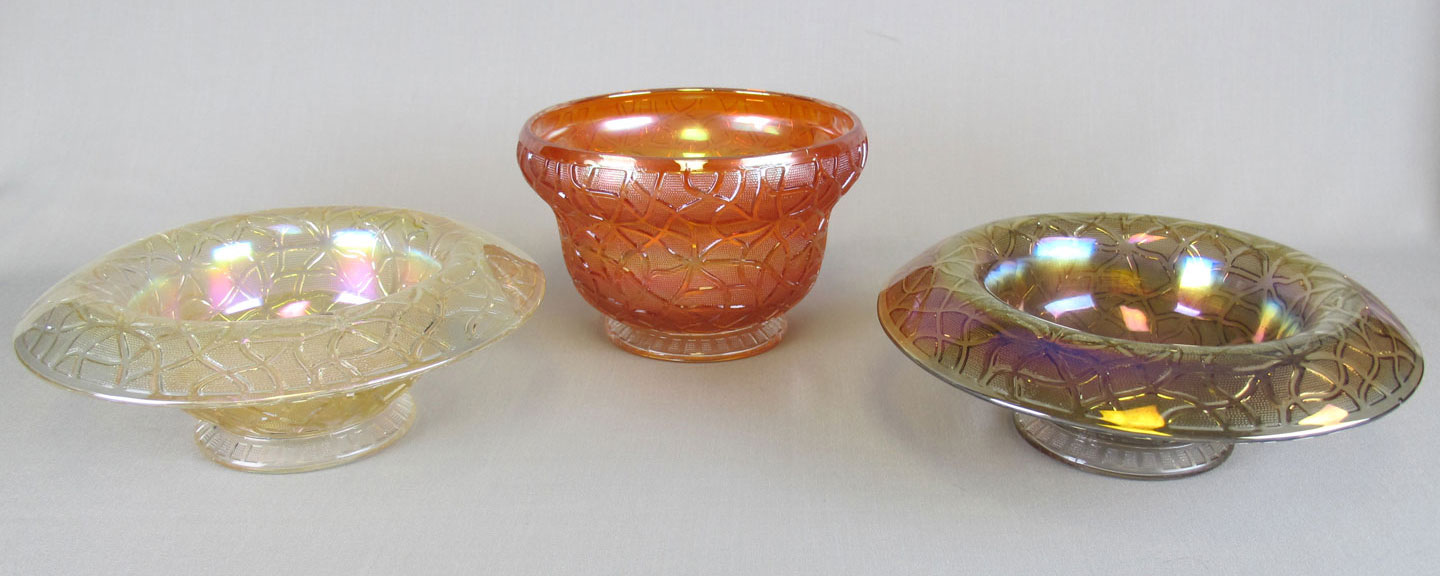 The marigold console bowl above left is unusual with its cupped-in top. Console bowls usually have the rim turned out and rolled down and would be paired with the two candlesticks on the right to form a console set. | |