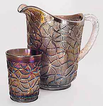 Found in water sets such as the pitcher and tumbler to the left, console bowls, chop plates made from the console bowls, and candlesticks. The pattern is found only in clambroth, marigold and smoke. |