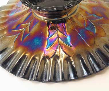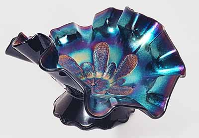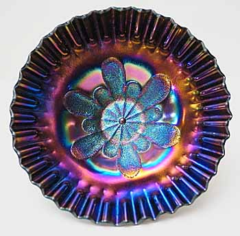 Large and small stippled petals extend from the center of the piece. All pieces have the typical Dugan domed foot. Purple is quite hard to find and very desirable, particularly in the crimped plate. In addition to ruffled, bowls are found crimped, three-in-one, banana shaped or whimsied into tricorner shapes. Occasionally a basket, made by attaching a handle, shows up.