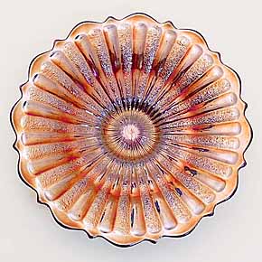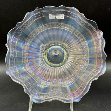 Several manufacturers made patterns with stippled rays as the primary design but they are often difficult to tell apart. There's no mistaking this one: It has Fenton's unique bracket edge and a back pattern called Scale Band. Many plates and bowls sold at auction and listed simply as Stippled Rays may in fact have the Scale Band back. Shapes are large and small bowls and small 7 inch plates all made in various colors.
