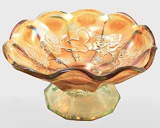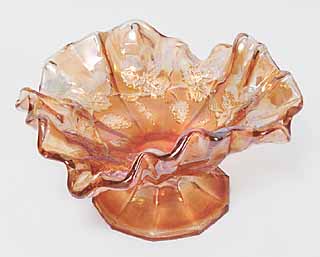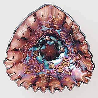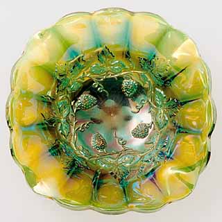 Strawberry Wreath, which some refer to as Millersburg Strawberry, uses essentially the same design as Millersburg's Blackberry Wreath and Grape Wreath patterns except that this one has no center detail other than a tiny dot on some shapes. No plates are known, but the bowls are often shaped in unusual ways, including tricorner and square. At the right. is an unusual Strawberry Wreath bowl that has been whimsied into a gravy boat shape. It's the only one known in vaseline and owned by Carl and Eunice Booker. Another is known in green. |