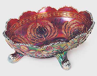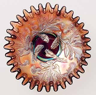 Fenton used two molds to make this pattern. One was used to make the bowls and rare plates, the other to make the banana boats. Bowls are found in ruffled, three-in-one, ice cream shape, and the tight crimped versions shown above left. Plates come in amethyst, blue, green and marigold while bowls come in the additional colors of amber, aqua, lavender and vesline. Bowls and plates have the wide panel exterior pattern.