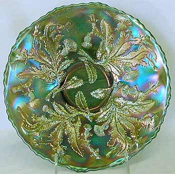This green plate sold for $3,400 at the 2012 Heart of America Carnival Glass convention auction. Photo courtesy of Seeck Auctions. Fenton used the bowl/plate mold to make advertising pieces for a company called Horlacher. As shown in the photo to the left, the word "Horlacher" is molded in script on the base of amethsyt, green and marigold bowls. |