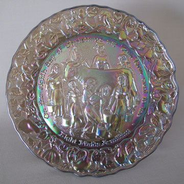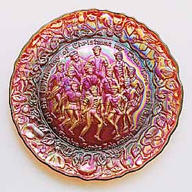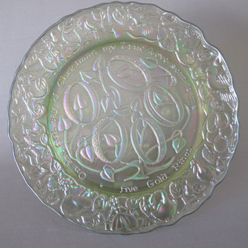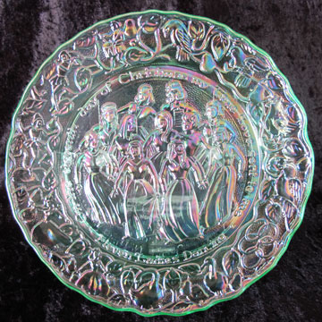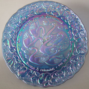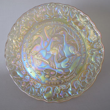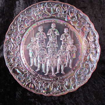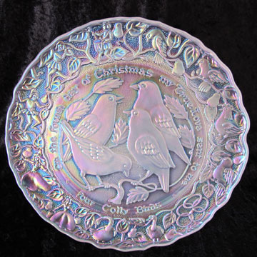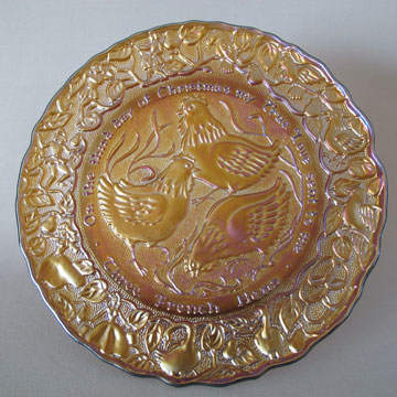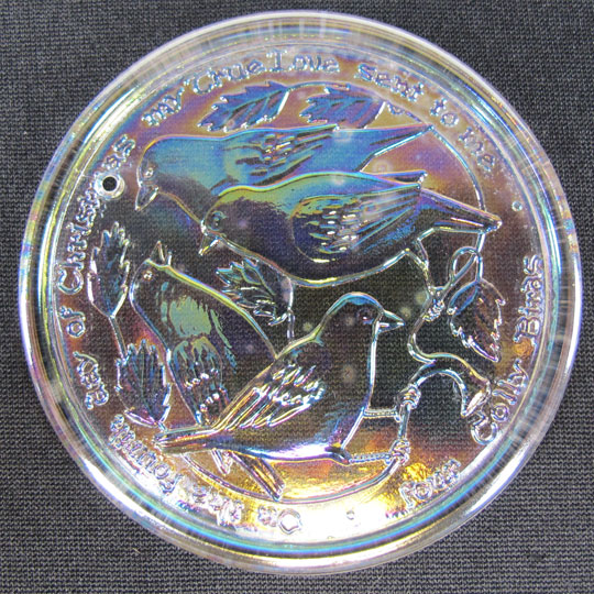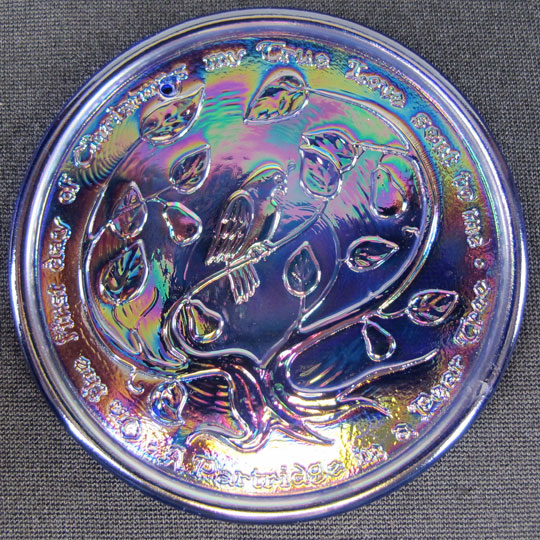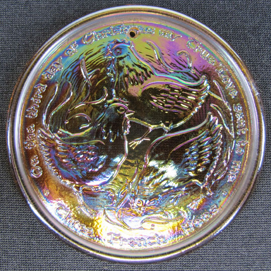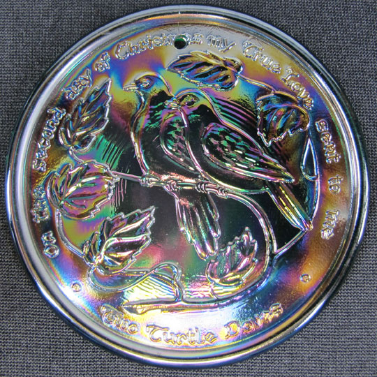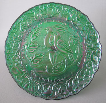 1970 - "A Partridge in a Pear Tree" in Aurora Jewels Carnival (cobalt) Rare in Red Carnival | 1971 - "Two Turtle Doves" in Dark Green Carnival | 1972 - "Three French Hens" in Amber Carnival | 1973 - "Four Colly Birds" in White Carnival |