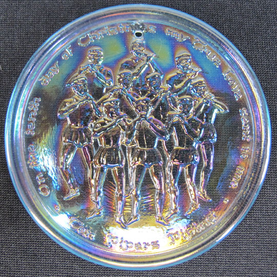 Imperial made Christmas tree ornaments to go along with their 12 Days of Christmas plates. They are three inches across and have a hole for a string. Only days 1 through 4 were made before Imperial closed, but, curiously, a day ten is also found. |