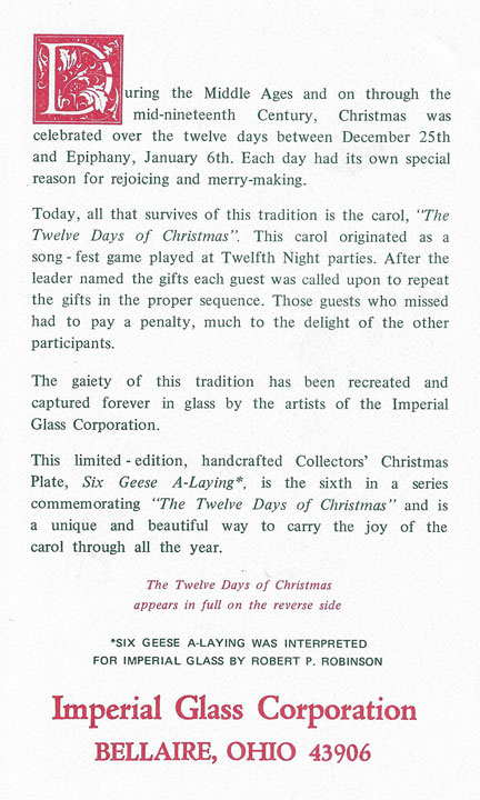 When you ordered a new plate each year, it arrived in a gold foil box and included the card below. Shown are the front and back of the card for the sixth plate - "Six Geese A-Laying". | ||