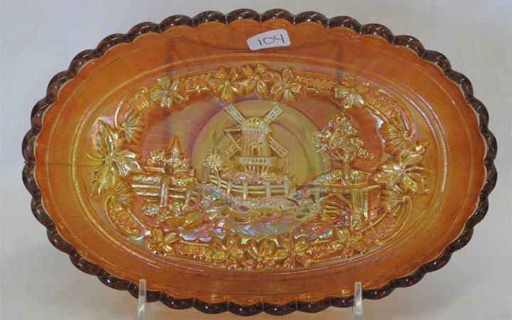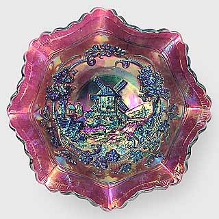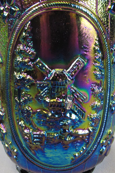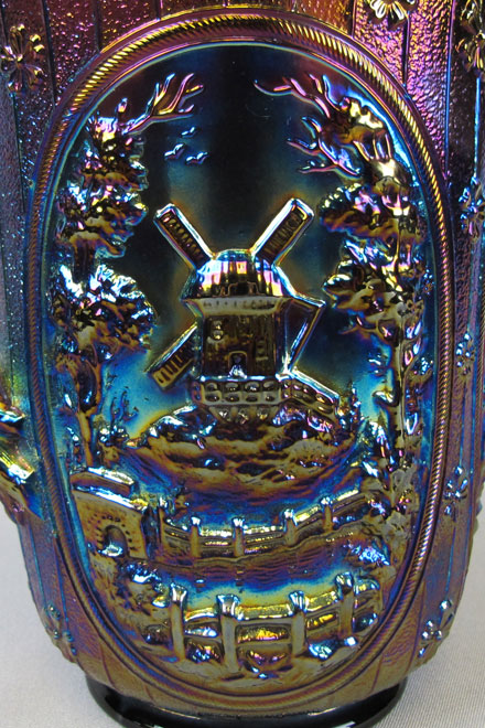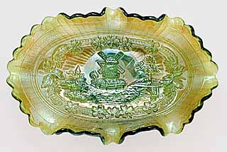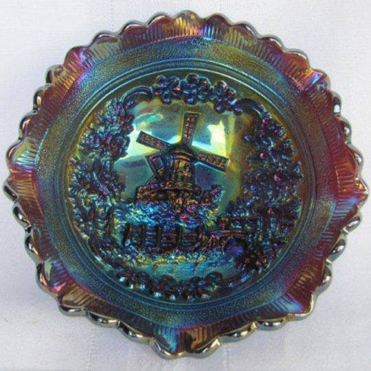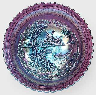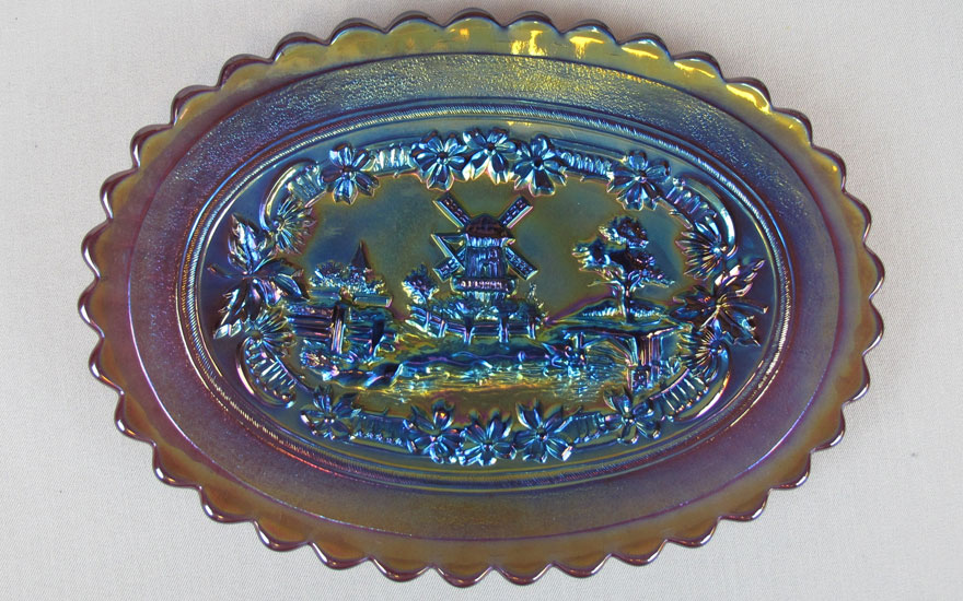 Both the Windmill pattern and the Double Dutch pattern are shown in old Imperial catalogs as mold #514 and thus they were part of the same line and should be considered the same pattern. While pieces commonly referred to as Windmill have only one windmill in each scene and Double Dutch has two, each scene of all the Windmill pieces are unique. Windmill bowls are collar based while Double Dutch pieces have three feet. Windmill bowls come in a large size, a standard size and a small sauce. At left is a typical ruffled standard sized bowl in purple. In the center is a large sized bowl which is often incorrectly called the variant pattern as it includes birds to the right of the windmill. The large bowl has other differences in the design, so birds were not simply added to the standard bowl. The photo on the right shows the typical exterior rib pattern of the Windmill bowls and the oval trays shown below.