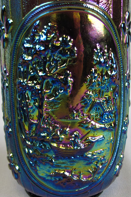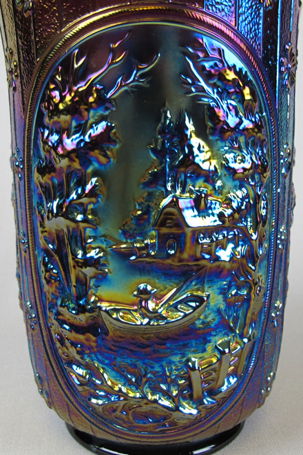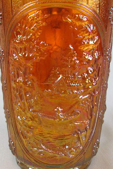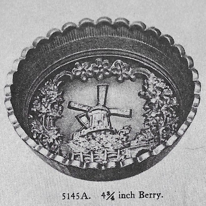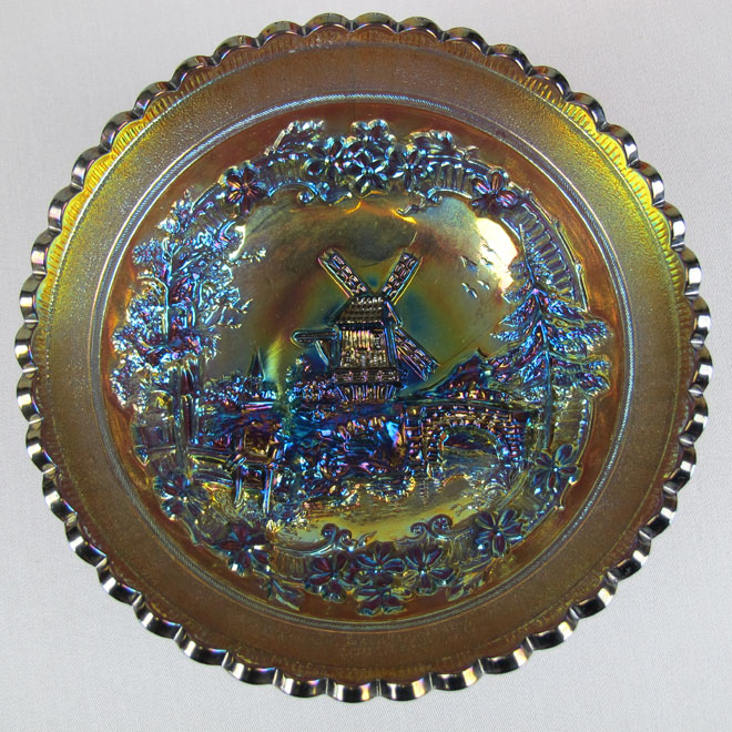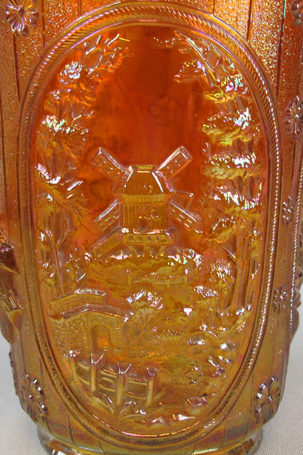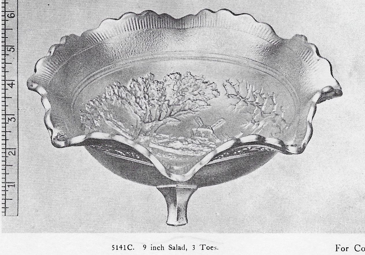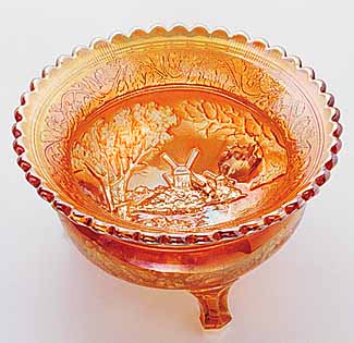 Double Dutch, pictured above, has two windmills and a fisherman in a boat. Double Dutch bowls have three feet and the Floral and Optic exterior. The round flared bowl on the left is in purple. In the center, is a marigold spittoon whimsey made from a bowl. The catalog picture is from an old Imperial catalog and shows the mold number as #5141C. #514 is the line, the fourth digit is the size and the final letter is often the edge shaping.